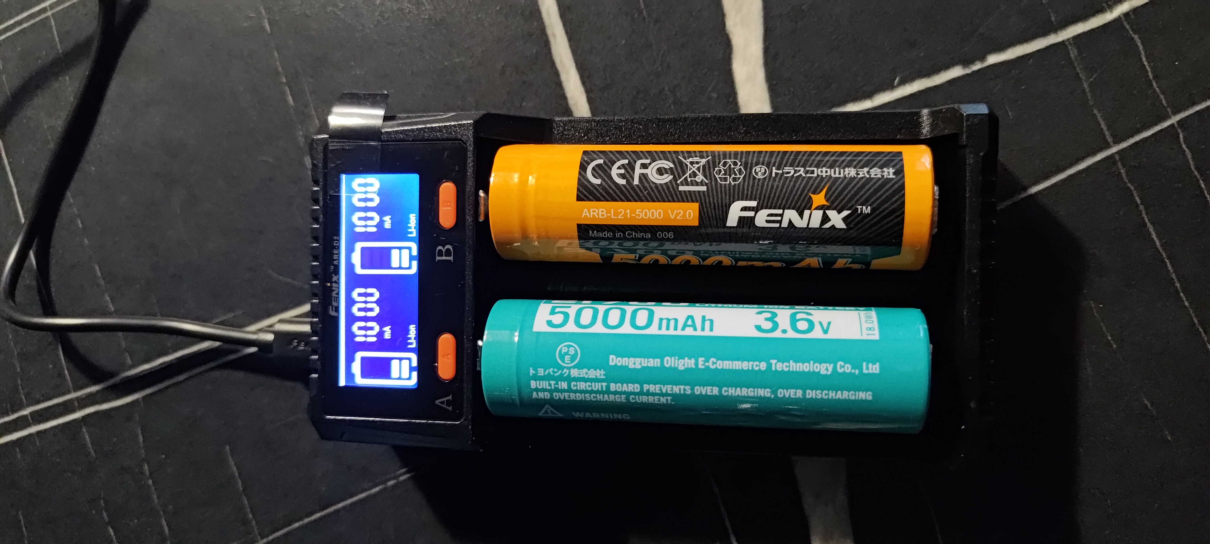 Одновременно можно подзарядить 2 элемента питания любого типа. Каждый из 2 слотов Fenix ARE-D2 работает независимо от другого. При этом, F самостоятельно определит, какой именно аккумулятор установлен в слот, и какая программа зарядки для него подойдет. Пользователь же в течение 8 секунд после подключения зарядного устройства к питанию может выбрать силу тока для зарядки. Для элементов питания Li-ion типа это 0,5А, 1А или 2А. Другим аккумуляторам доступно 2 варианта: 0,5А или 1А.